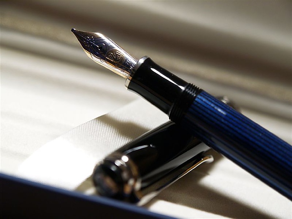 裡面放的是Pelikan Souverän M805 OB nib藍色賽珞珞條紋桿,綠色經典而藍色清爽,不過二手品畢竟不容易要求,正巧有M805這款大筆,又正好是喜歡的條紋桿,就別介意~